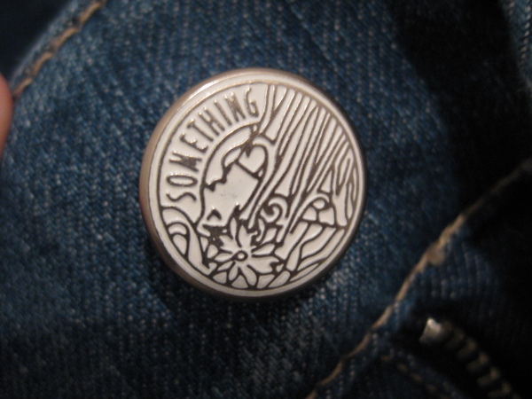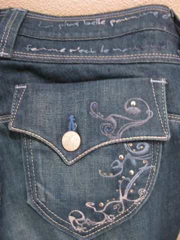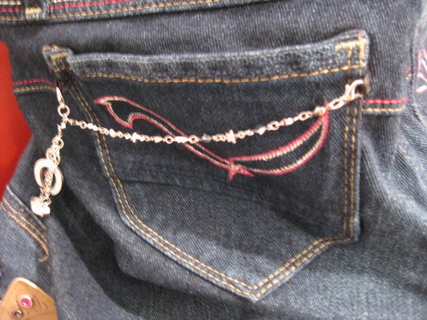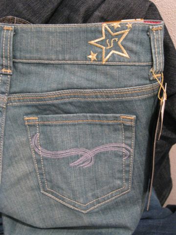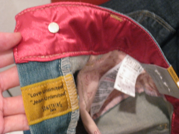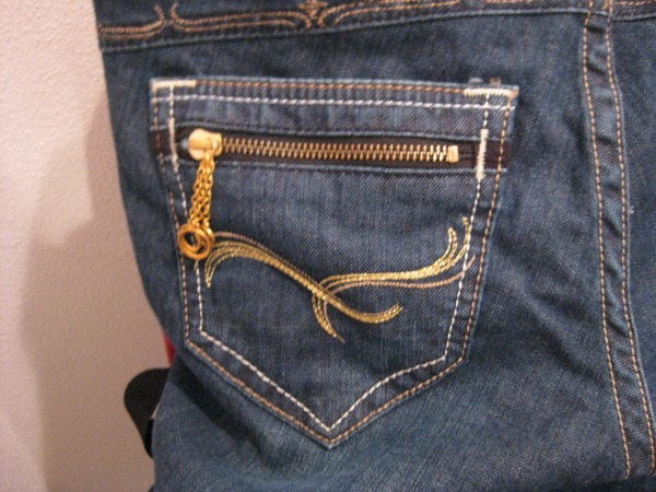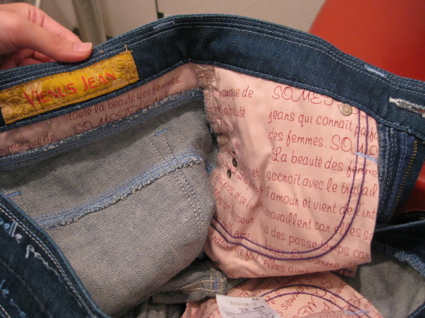 這件設計很簡單,外頭腰頭有星星狀刺繡,口袋設計也超素,正面釦子部分也很素,一整個很素,但是內面卻用了大喜色的紅亮亮布,是很悶騷的褲子! XD