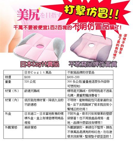 這款墊子因為太熱賣了,網拍上有很多大約280-350左右的仿冒品,沒有正品的外盒,多半就是用塑膠袋裝裝,據說那兩團高起的填充物也不太有支撐力。我不太確定是否便宜盜版貨就一定沒用,貴的正品就一定有用,但是既然是要求功能性的,我還是會比較傾向買正品啦。要買網拍品的人要小心盜版喔!